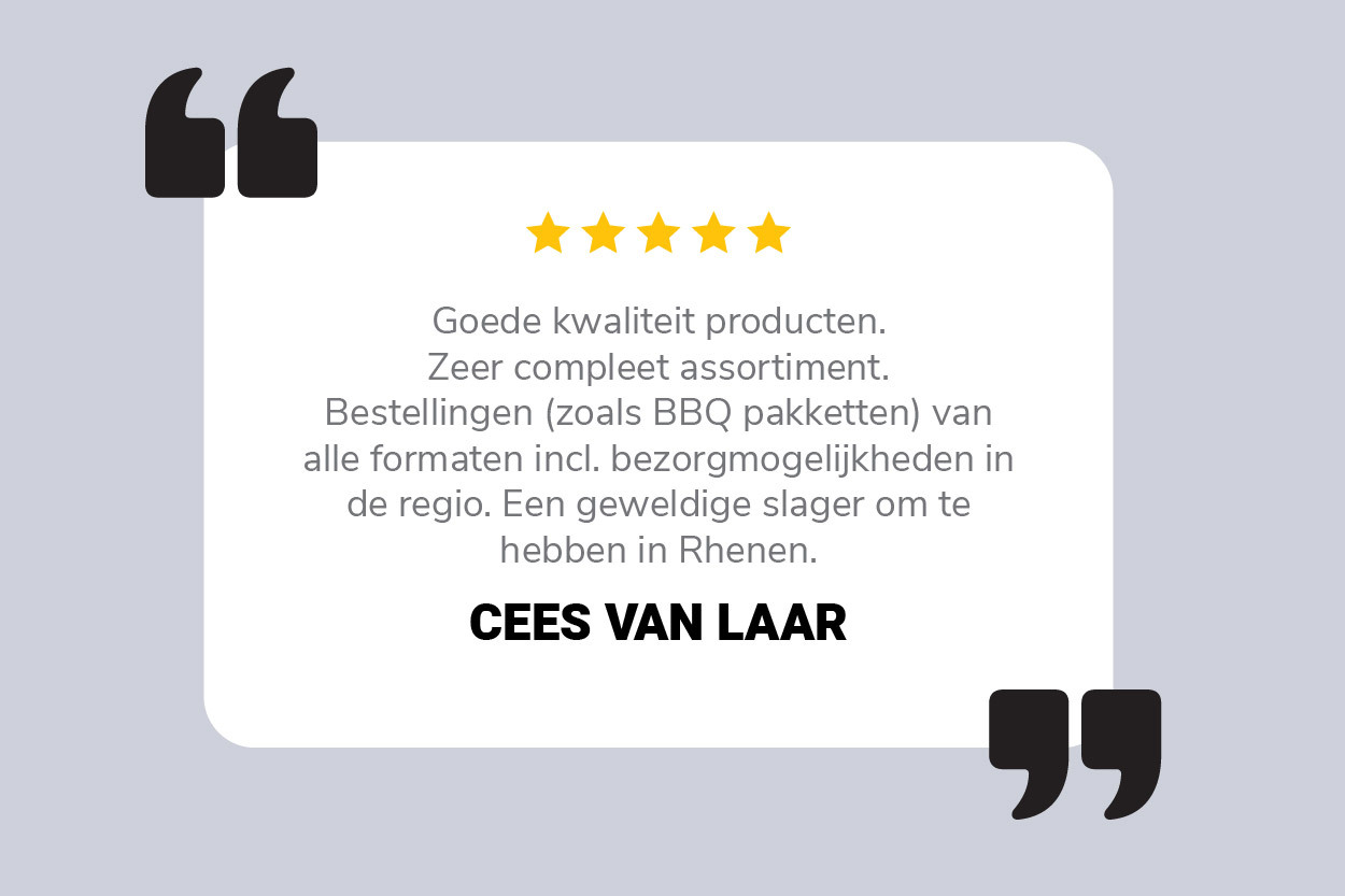 In het hartje van Rhenen, vindt u onze gezellige slagerij. Lekker dichtbij de groenteboer en de bakker, zodat u al uw versproducten, met gemak, in huis kan halen. 6 dagen in de week staan wij met veel liefde en aandacht voor u klaar. Wij kunnen er intens van genieten wanneer u met een tevreden blik de deur uit gaat en nemen daarom ook graag de tijd voor u.